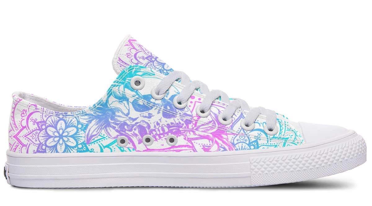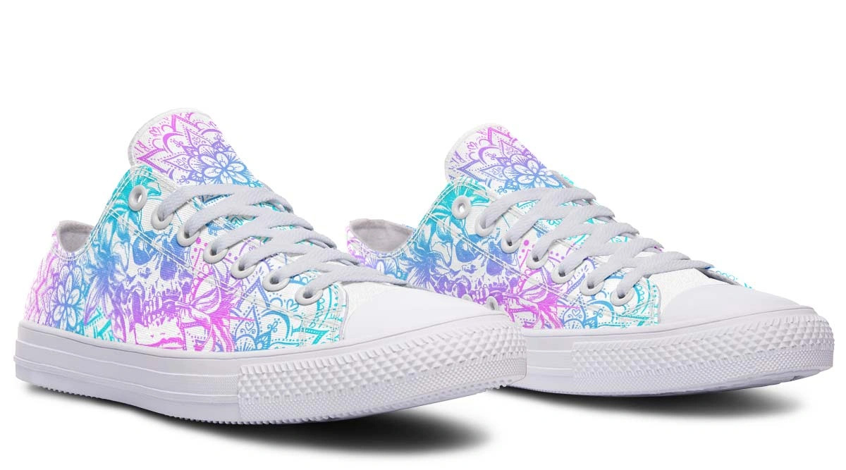 Discover the perfect balance of beauty and edge with Lily Flower Skull Low-Top Sneakers. Elegant floral patterns meet bold skull motifs for a unique look.